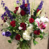 Recipe: Purple and White Larkspur, Red Roses, Pink Stargazer, Purple Lisianthus, White Hydrangaes and green succulent in a short vase.