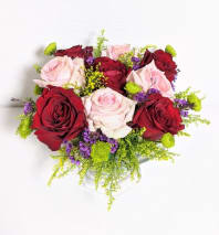 A cute mix of different fresh flowers in a nice and sturdy wood box!