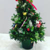 Boxwood Christmas Tree in a Holiday decorated container. Decorated with red and white fresh flowers, red velvet bow, candy canes.