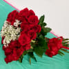 Long stem roses in a heart shaped bouquet tied with a satin bow.