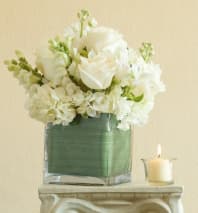 A BEAUTIFUL SERENE ARRANGEMENT IN ALL WHITE WITH ROSES, HYDRANGEAS, AND ORIENTAL LILYS, WILL SHOW THEM HOW YOU FEEL.