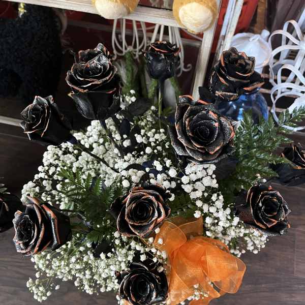 The corsage came out so beautiful! I chose a little less baby’s breath and had the tips of the roses sprayed black and it came out stunning! I would totally recommend Gina and use her every time we need flowers!!