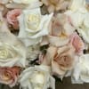 Mixed white, nude and ivory French roses with white hydrangeas and rich foliage in a 8 inch white Ceramic pot.