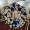 Large blue and white sympathy wreath. Perfect for a male's services. It is designed with roses, lilies, daisies, cushion pompoms and wax flowers. The banner is sold separately by searching "Sympathy Banner"