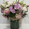 Medium high floral arrangement compose of an assortment of Jules Elie peonies, lavender phalaenopsis, Festiva maxima peonies, blush calla lily's, light pink hydrangeas, surrounded by jasmine and rice flowers from California farms.