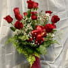 PICTURED: 12 long stem red roses, babies breath, fillers.