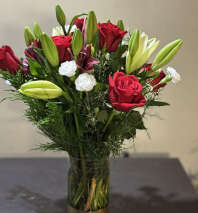 This stunning floral arrangement features lush roses and graceful lilies, beautifully accented with fresh pine tree greens and delicate small white flowers. Designed in a luxurious gold-dipped vase, the combination of soft blooms and rich greenery creates a timeless and elegant look. Perfect for celebrations, sympathy, or adding a touch of refined beauty to any space.