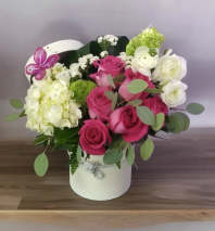 This sophisticated arrangement features an elegant mix of white and cream blooms, including roses, tulips, and hydrangeas, arranged in a sleek box. The perfect gift to express love and appreciation on Valentine's Day. This arrangement offers a neutral and timeless expression of love and is sure to make a lasting impression.