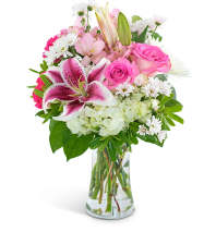A joyful burst of color and fragrance, this Mother’s Day bouquet celebrates her with a symphony of blooms. Warm coral roses and soft blush spray roses mingle with the playful pop of fuchsia gerbera daisies, while lush white hydrangeas bring a grounding elegance. Pink oriental lilies open in graceful arcs, complemented by clusters of purple stock and lilac-hued blooms for a touch of serenity. This design is finished with delicate sprays of pink waxflower, creating a lush, garden-fresh arrangement that mirrors the beauty and love she shares every day.