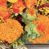 A vibrant, fiery celebration of fall, Autumn Ember Harvest bursts with rich orange marigolds, safflower, golden craspedia, and sunset-toned spray roses. Deep burgundy amaranthus adds dramatic texture and height, while soft yellow solidago weaves warmth throughout the bouquet. Designed in a rustic mason jar with natural raffia, this arrangement captures the cozy glow of autumn and brings a touch of seasonal charm to any home or event.