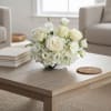 The White Elegance Rose Arrangement is a refined floral design featuring creamy white roses, delicate lisianthus, and soft hydrangea arranged in a modern ceramic bowl. The gentle ivory tones create a timeless and sophisticated look that brings calm elegance to any space.