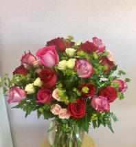 A colorful arrangement containing lilies, roses, bells of Ireland, gerberas, etc.. Suitable for any occasion!