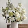 A soft, sculptural design in creamy whites and fresh greens. Layered roses, airy blooms, and gentle texture create a look that feels light, modern, and effortlessly elegant like a cloud of petals.