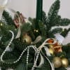 A festive holiday centerpiece made with fresh, fragrant evergreen in a gold pot, styled with a tall green taper candle, gold ornaments, dried orange slices, and soft ribbons + pearl garland for an elegant finish. A touch of gingerbread charm makes it feel extra cozy and gift-ready. Perfect for tables, entryways, hostess gifts, and holiday parties.