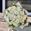 Classic white bouquet featuring white roses, soft hydrangeas, and delicate lisianthus. An elegant and timeless arrangement perfect for weddings, anniversaries, or meaningful moments.