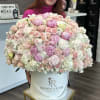A luxurious garden - style arrangement featuring a soft, romantic palette of blush and pastel blooms.This design is artfully composed with premium roses, spray roses, peonies, hydrangea, and seasonal accent flowers, creating a full and elegant presentation. Designed in our signature box , this arrangement exudes timeless beauty and refined charm - perfect for celebrations, milestones, or making an unforgettable statement.