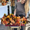 A vibrant composition that captures the warmth and richness of fall. This deluxe box features a stunning mix of sunflowers, rose, calla lilies and seasonal foliage, accented with fresh citrus elements for a bright, modern touch. The harmonious blend of deep orange, golden yellow, and earthy brown tones creates an energizing yet elegant centerpiece - perfect for festive occasions, corporate gifting, or adding a burst of sunshine to any space.