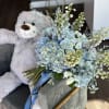 The bouquet showcases an exquisite arrangement of flowers in varying shades of blue, each bloom carefully selected for its exceptional quality. The luxurious flowers are artistically arranged to create a refined, harmonious composition, with the deep, vibrant blues and delicate lighter hues blending seamlessly for a sophisticated and elegant display.