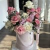 This arrangement, nestled in a chic box, showcases white and pink roses with fully open petals, their soft tones and gentle fragrance creating a romantic, airy feel. The blooms are artfully arranged to highlight their natural beauty, making the box a tender expression of elegance and charm.