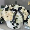 A chic floral arrangement in a white pumpkin, featuring white roses and orchids with a touch of black elegance.