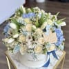 A white box encloses a tranquil scene of light blues and soft whites, where flowers bloom in a serene arrangement. The simplicity of the colors, paired with the floral elements, captures the quiet beauty of Passover, symbolizing the fresh beginnings and spiritual awakening that accompany the holiday.