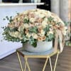 An exquisite dome arrangement of fresh white and Quicksand roses in a modern vase. Creamy ivory tones blend seamlessly with soft dusty blush-beige hues, creating depth and harmony. Finished with delicate eucalyptus and a signature ribbon detail, this piece embodies understated luxury and natural beauty.