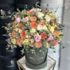 A delicate floral composition featuring lush garden roses, elegant ranunculus, and charming spray roses, complemented by seasonal blooms in soft peach. blush pink. fresh green, and crisp white tones. Arranged with care in our signature box, this bouquet radiates natural beauty and refined elegance - perfect for any heartfelt occasion.