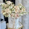 Pure, elegant, and timeless - The Bride features soft blush roses, ivory blooms, and delicate white florals, finished with a graceful stand of pearls adorning our signature box. Inspired by classic bridal beauty, this arrangement is perfect for weddings, bridal celebrations, or to celebrate any occasion with refined elegance.