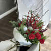 A festive winter bouquet combining classic red roses with vibrant berry branches, rich anthurium blooms, and fresh evergreen foliage. Soft metallic ornaments and pine accents add a seasonal sparkle, creating a refined yet warm holiday statement.