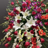 This Grand and Beautiful standing spray, made with purple and white dendrobium orchid, red roses, white lily and red gladiolus. This arrangement will defiantly stand out and make a statement on its own, without words.