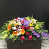 This beautiful casket spray make with lavender hydrangea and stock , peach Gerber daisy , yellow lily and snap, pink roses and carnations
