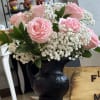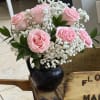 The design is full and balanced: clustered rose blooms form the centerpiece while the tiny white filler flowers add a cloudlike texture and delicate movement around each stem. The compact black vase grounds the composition and makes the pastel petals pop, giving the arrangement an elegant yet slightly rustic polish that suits a bedside table, office desk, or entry console. Arranged for immediate display-place in a cool spot away from direct sun, refresh the water every couple of days, and trim stems slightly if needed to extend vase life.