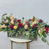 Romantic shades of deep red, pink and peach roses, stock, snap dragons, safari sunset, gerbera, veronica and seasonal berries tucked into botanical eucalyptus, magnolia and seasonal greens in a metal garden box.