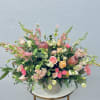 This stunner is pinks and more pinks! Premium blush and pink roses, larkspur, snapdragon, stock, veronica, spray roses and lisianthus tucked into botanical eucalyptus and seasonal greens in a contemporary cement pot. This beauty is romantic and tender for any occasion.