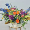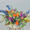 Color Bomb! Blue delphinium, protea, Inca Leucadendron, snapdragons, stock, hypericum and roses tucked into botanical eucalyptus and seasonal greens in a neutral ceramic pot. This one is a show stopper!