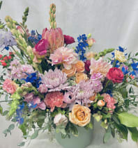 Soft pastels of stock, snapdragons, roses, and seasonal wild flowers in a neutral ceramic pot paired with botanical greens & eucalyptus