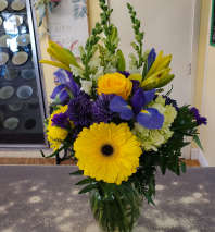 Bright and cheerful arrangement. Perfect for a birthday or just because.