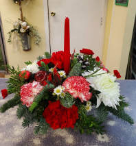 Round table arrangement filled with assorted winter greens and seasonal flowers with candle.