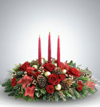 - Rich red velvet bows and striped ribbon accents for a classic holiday touch