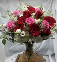 A sweet summery collection of flowers that will brighten the day. Pretty pink roses, yellow sunflowers and Chrysanthemums make up this vibrant design. We also offer fragrant candles, Teddy Bear Plush, Chocolates and even Vintage Brooches as a finishing touch.