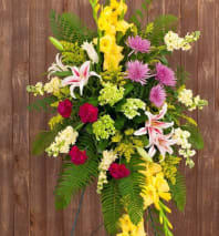 This beautiful casket piece includes peach roses, soft pink and coral spray roses, pale orange gerberas and carnations, soft yellow stock and peach hypericum. All of this is accented with satin ribbon and assorted greenery.