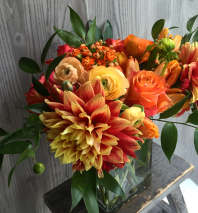 Summer crush! Orange roses, white lisianthus and dahlias with fresh summer greenery.