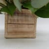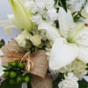A lush mix of white flowers arranged in neutral cube container.