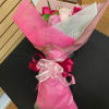 18 mixed pink roses with wax flowers and greenery, wrapped in deluxe paper.