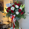 Florero con 24 rosas lirios y gerberas