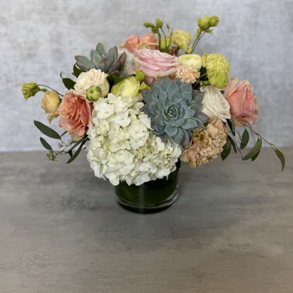 The arrangement was pretty- however, the hydrangea color was much more of a baby blue, which was somewhat disappointing since I chose the arrangement for it's almost purple hue. Otherwise, pretty.