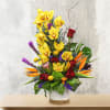 This unique design includes yellow cymbidium orchids, birds of paradise, orange lilies, red roses, purple liatris, ice protea, safari sunset, dianthus green trick, crespedia, purple statice, blue thistle, and lush tropical foliage.