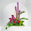 This unique design includes calla lilies, liatris, spray roses, thistle, and tropical foliage.