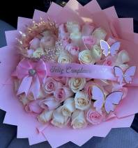 exclusive bouquet of deep red roses, framed with delicate baby’s breath and adorned with an elegant crystal crown and golden butterflies. A sophisticated and symbolic design, perfect for expressing love and making a lasting impression this Valentine’s Day.”