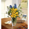 Yellow roses, spray roses and asiatic lilies, white spray roses and stock and the ever-delightful light blue delphinium are delivered in a Jewel Vase. C'est magnifique!